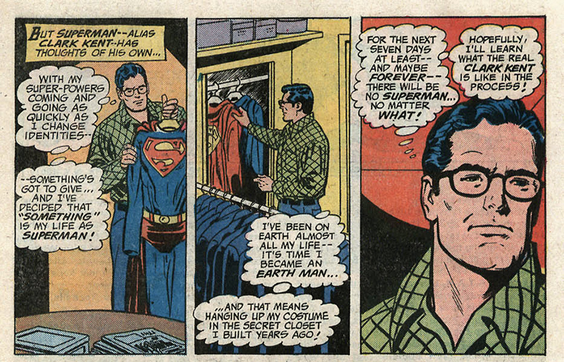 In the previous issue, a mysterious phenomenon had left the Man of Steel super-powerful only when dressed in his battle costume, and powerless in his Clark Kent street clothes.  Convinced this complication would make the continuance of his dual identity impossible (despite other heroes managing similar arrangements all the time), Superman resolved to choose between one persona or the other: either be a superhero 24/7 or hang up the cape for good and live a “normal” life as mere mortal Clark Kent.