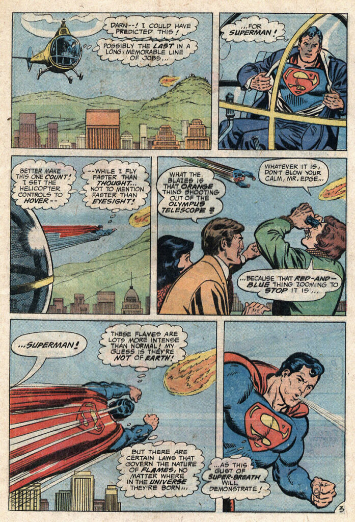 A blast of super-breath fails to extinguish the big orange flame, as does a wave of water.  Finally, Superman successfully smothers the flame in a funnel of sand, tracing the fireball back to its source at the observatory and knocking out the crooks who’ve somehow turned a harmless telescope into a flame-throwing menace.