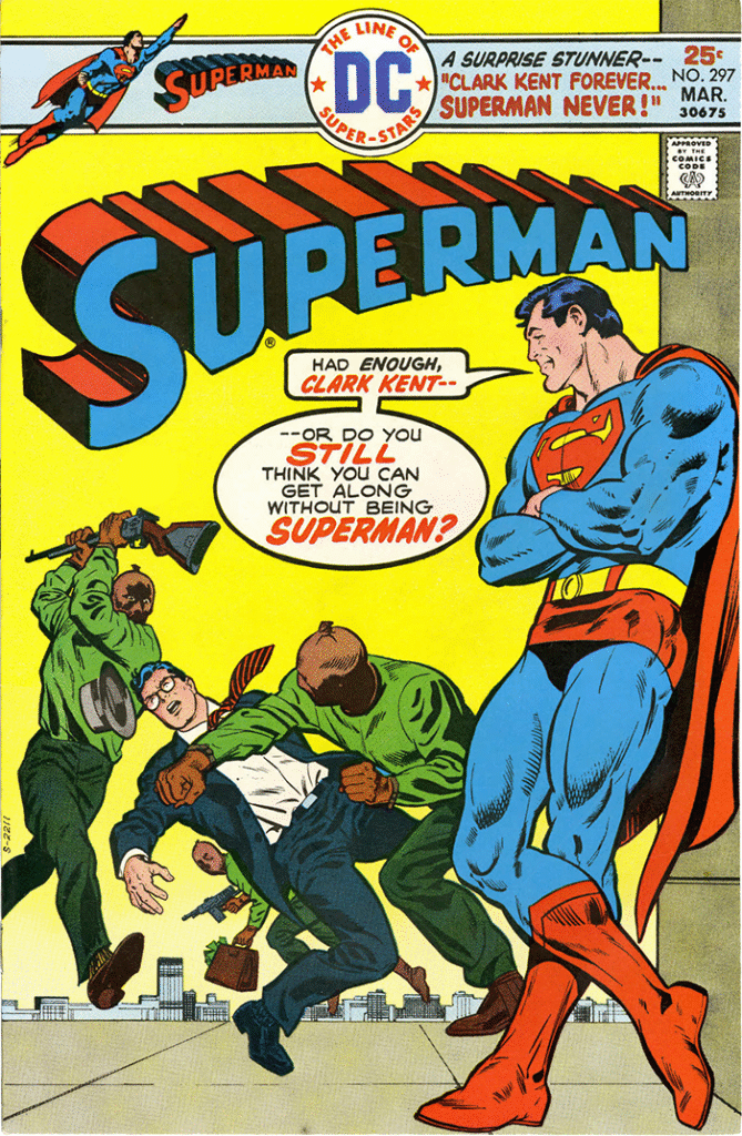 Despite appearing on newsstands in December of 1975, Superman #297 did not feature a holiday-themed story, but it still added up to a Christmas of sorts for Clark Kent.  Emerging at last from the long shadow of his Superman alter ego, the perennial “mild mannered reporter” finally got his moment in the sun, free at last to stand up to bullies, engage in romance and even charge into heroic action against a band of high-tech gangsters.