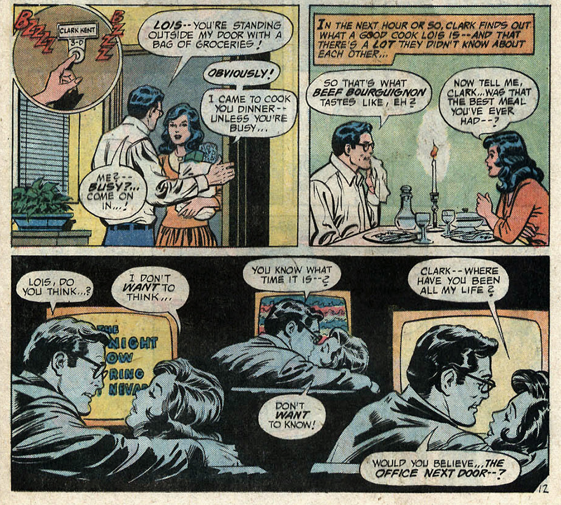 Clark and Lois make out…and perhaps much more. Fans would speculate for years about exactly what happened in the time it took us to turn from Page 12 to 13; did they or didn’t they?  Lois’ attitude at the office the next day suggests maybe they did.