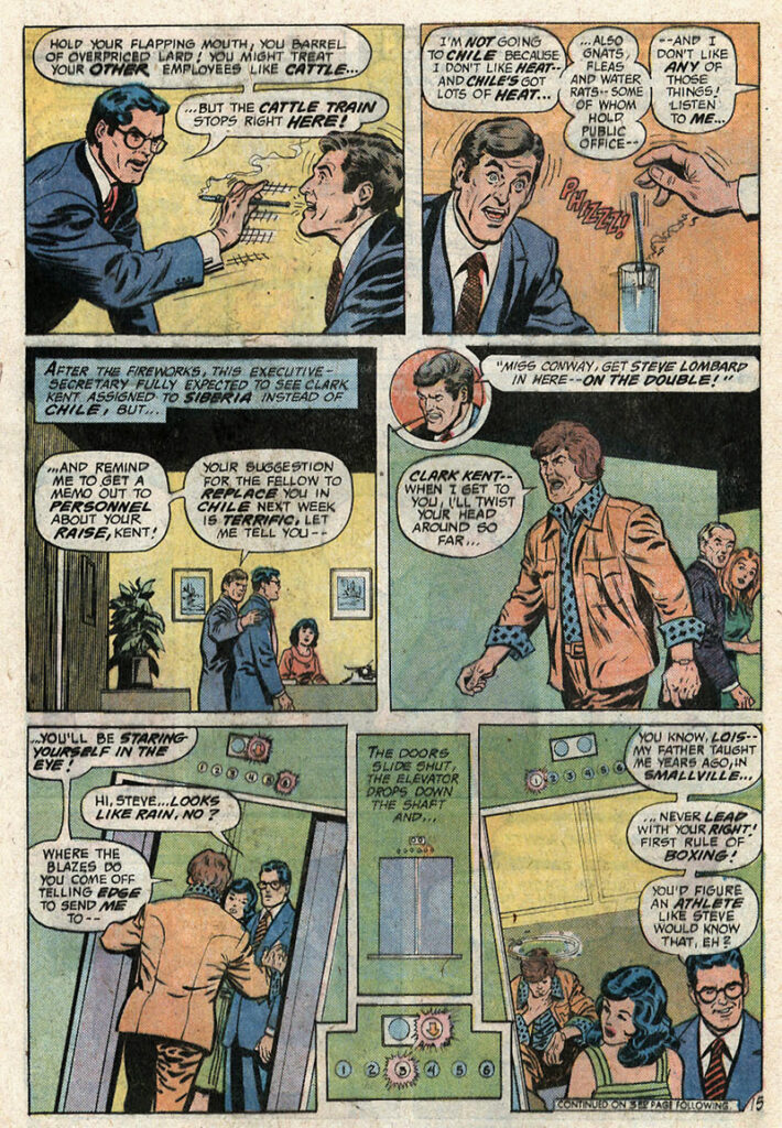 Back at the office, Morgan Edge tries to saddle Clark with an assignment he really doesn’t want.  Clark is very vocal in his objections, calling Edge names and yanking his ever-present cigarette holder out of his mouth.  Clark suggests sending Steve Lombard in his stead, a development that sits poorly with Steve, who comes looking for Clark with murder in mind.  But it’s okay; the two coworkers settle their differences like gentlemen. Just kidding; they get into a fistfight in the elevator.
