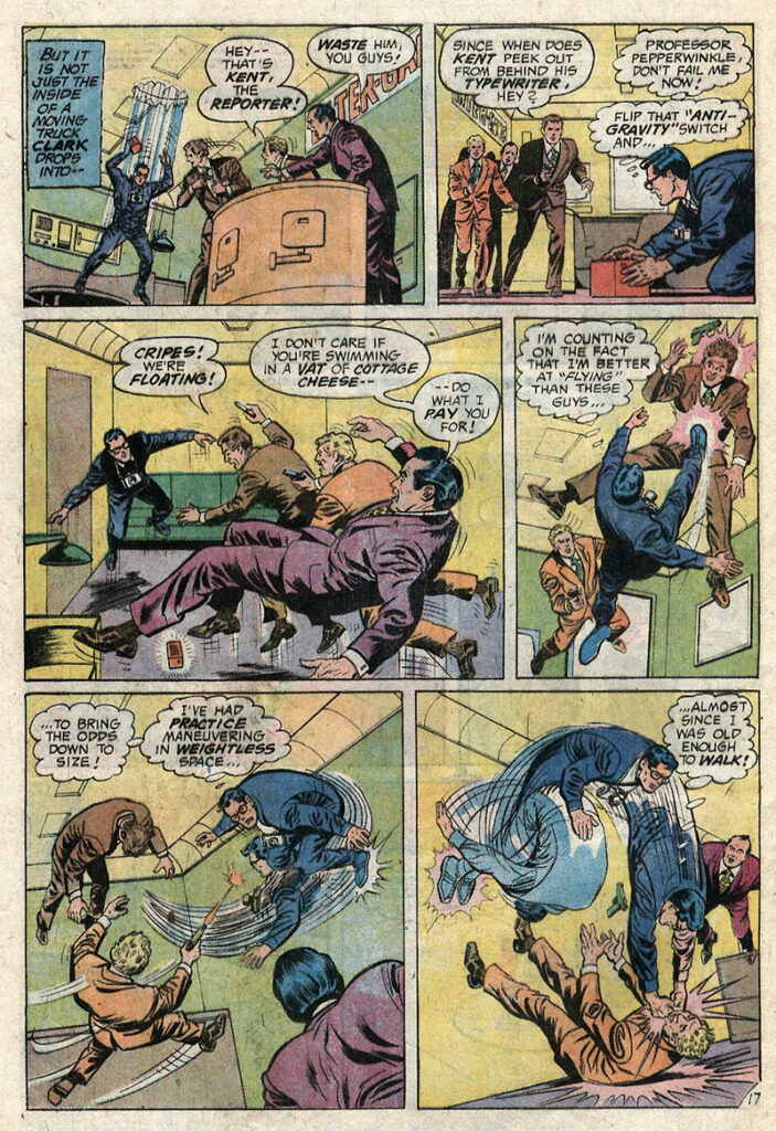 Anyway all this tough guy stuff apparently proves addictive to Clark, who decides to risk his life in a physical assault on Intergang.  Borrowing an anti-gravity device from his friend Professor Pepperwinkle, he breaks into Intergang’s mobile hideout and uses the gadget to disorient the bad guys by floating them off their feet.  Having clocked countless hours of flying time over the years, Clark is able to quickly adapt to the zero-G environment and makes short work of the gang.