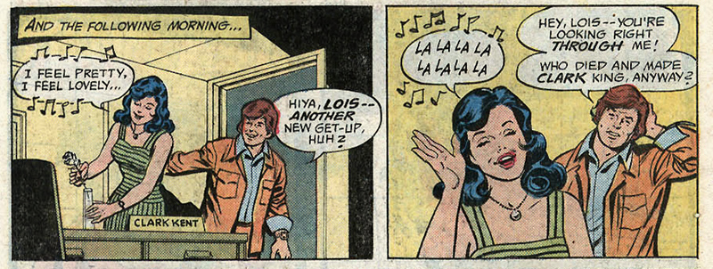 That said, the whole affair is suffused with a very 70s “macho” ethos, where being a “real man” means hitting harder, yelling louder and walking with more swagger than any other guy in the room. Lois witnesses Clark’s petulant table-tossing tantrum in an “exclusive” restaurant (an arguably disproportionate response to having water splashed down one’s chin) and far from being mortified, she is obviously turned on, asking Steve, “How do you like finding out that milksop Clark Kent is capable of acting like a man?” Likewise the eternally domineering Morgan Edge responds to Clark’s insolence and insubordination not by firing him but by assuming a submissive posture in the presence of the new alpha male in the office. Confronted by Steve in the elevator, Clark answers physical assault in kind and there’s nary a hint Human Resources will have a problem with any of it.  Remember kids, a real man bulldozes his way through life, and to the victor goes the spoils.  Accept no insults, meet violence with violence and never let your boss stick you with a task you don’t like; women will love you for your ability to beat up other guys and your boss will probably promote you for telling him where to get off.