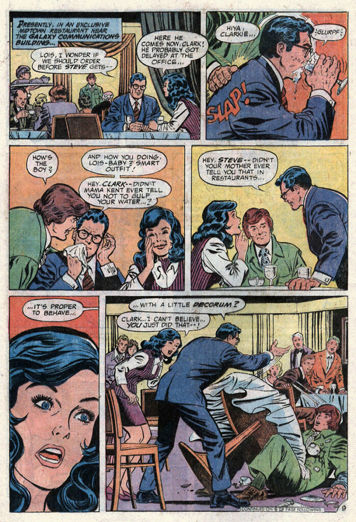 We then cut to an “exclusive” restaurant, where Clark and Lois wait to be joined by sportscaster Steve Lombard, who arrives in his usual overbearing, bullying manner but finds to his surprise that the worm has turned.
