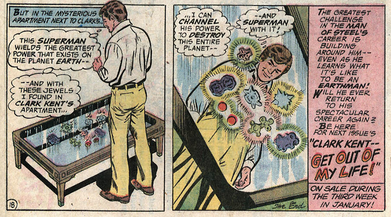 With this accomplished, Clark ends his day by taking Lois back to his place with the promise of a “great romantic view of the apartment across the street” (as seen from his bedroom, no doubt).  Meanwhile, next door, Xviar has assembled a set of otherworldly jewels he’s pilfered from Clark’s apartment, certain that with them he can destroy Superman and the Earth.