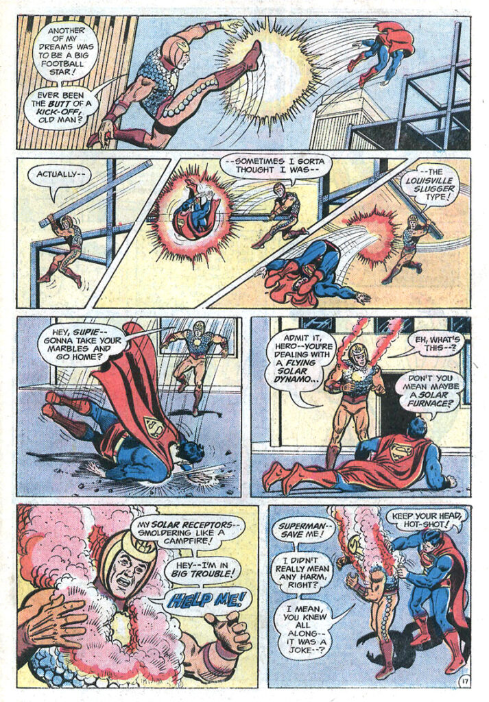 At last comes the inevitable showdown with Solarman, and for a while the neophyte villain seems to be on the winning side of things, until his sun-powered suit suddenly malfunctions and nearly roasts him alive. It turns out Superman has deliberately taken a beating to prolong the fight and give the suit time to overload with energy. Now he strips it off his foe and hurls it into space, where it explodes.