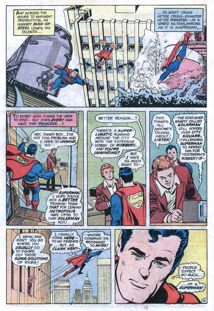 Resuming his patrol, Superman foils a bank robbery by grabbing the getaway car and shaking out the crooks and their loot, but the latter flies up, up and away into the pockets of that mysterious costumed character we saw earlier, now revealed as a villain who calls himself “Solarman,” and who teleports (or super-speeds?) from the scene. No matter; the villain will meet his comeuppance in good time, reasons Superman, and until then there’s no shortage of tasks to keep a superhero busy. Indeed, when he craves a moment of downtime with his friends, their attitude is basically, “Shouldn’t you be working?”