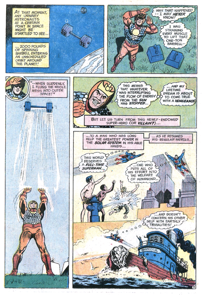 First, however, he needs to check his “World Crisis Monitor System” to make sure no situation requires his intervention. Unfortunately, it’s on the fritz. He quickly concludes this is due to a solar flare and flies to the sun to resolve the issue, coincidentally also solving the problem of a new-on-the-scene costumed character who’s designed a solar-powered costume to collect the rays of the sun and give himself Superman-like powers. But is he friend or foe?