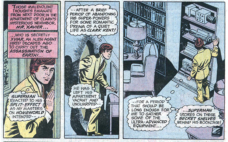 Meanwhile next door, the mysterious “Mr. Xavier” — aka “Xviar” from an unnamed alien planet — waits until Clark’s apartment is empty and sneaks in for the third time in three issues, looking to steal certain articles of high-tech gear from Superman’s secret storage area. Why this guy has to keep pilfering gadgets one at a time over the course of weeks instead of grabbing everything all at once is anyone’s guess, but anyway we need to check in on this sub-plot as a reminder of Xviar’s existence. (We know it’s him because he’s still wearing the same lemon yellow suit he’s had on since landing on Earth twenty years ago.)